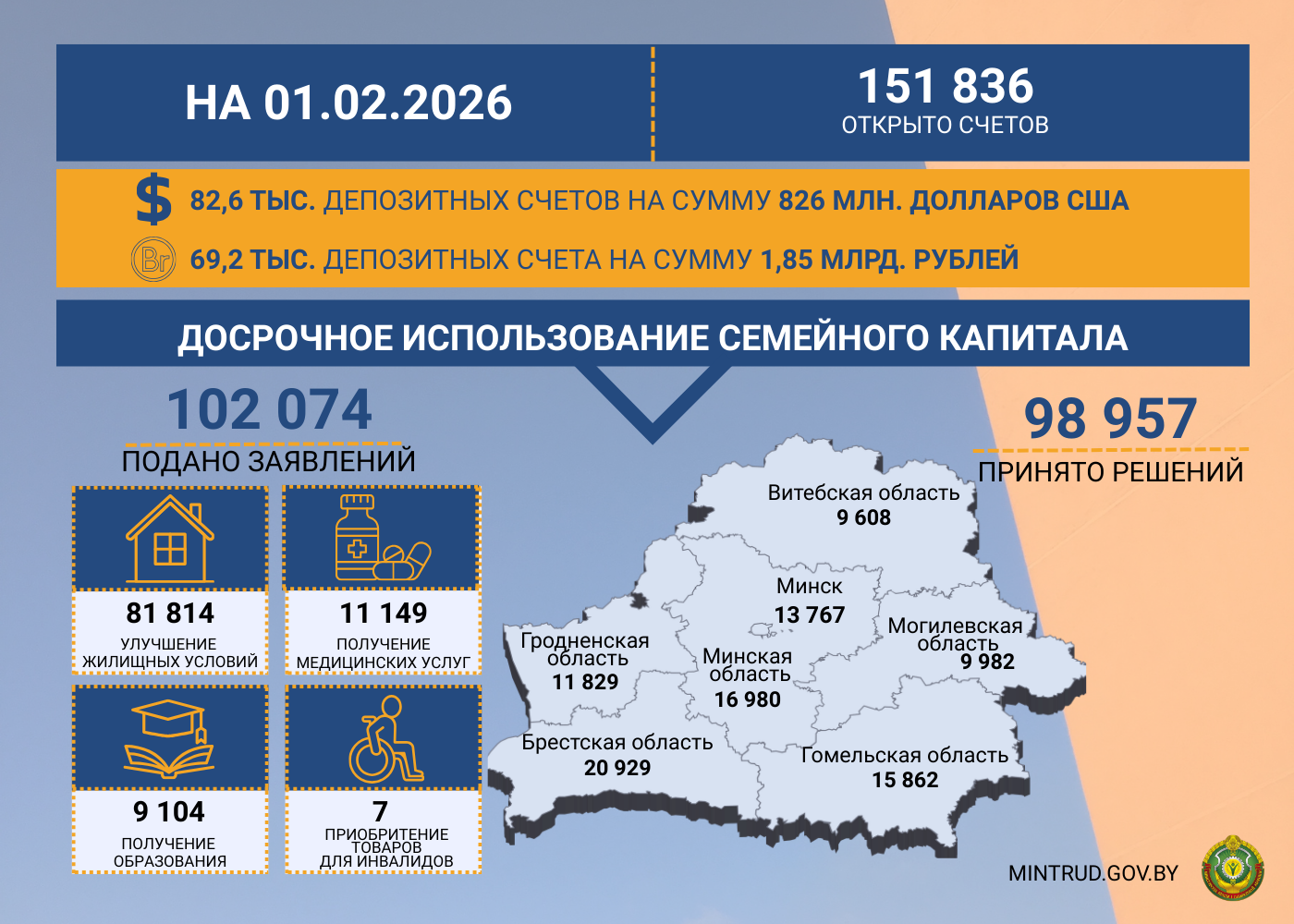 Принято 98 957 решений о досрочном распоряжении средствами семейного капитала, из них: Брестская область – 20 929, Витебская – 9 608, Гомельская область – 15 862, Гродненская область – 11 829, Минская – 16 980, Могилевская – 9 982, г. Минск – 13 767.