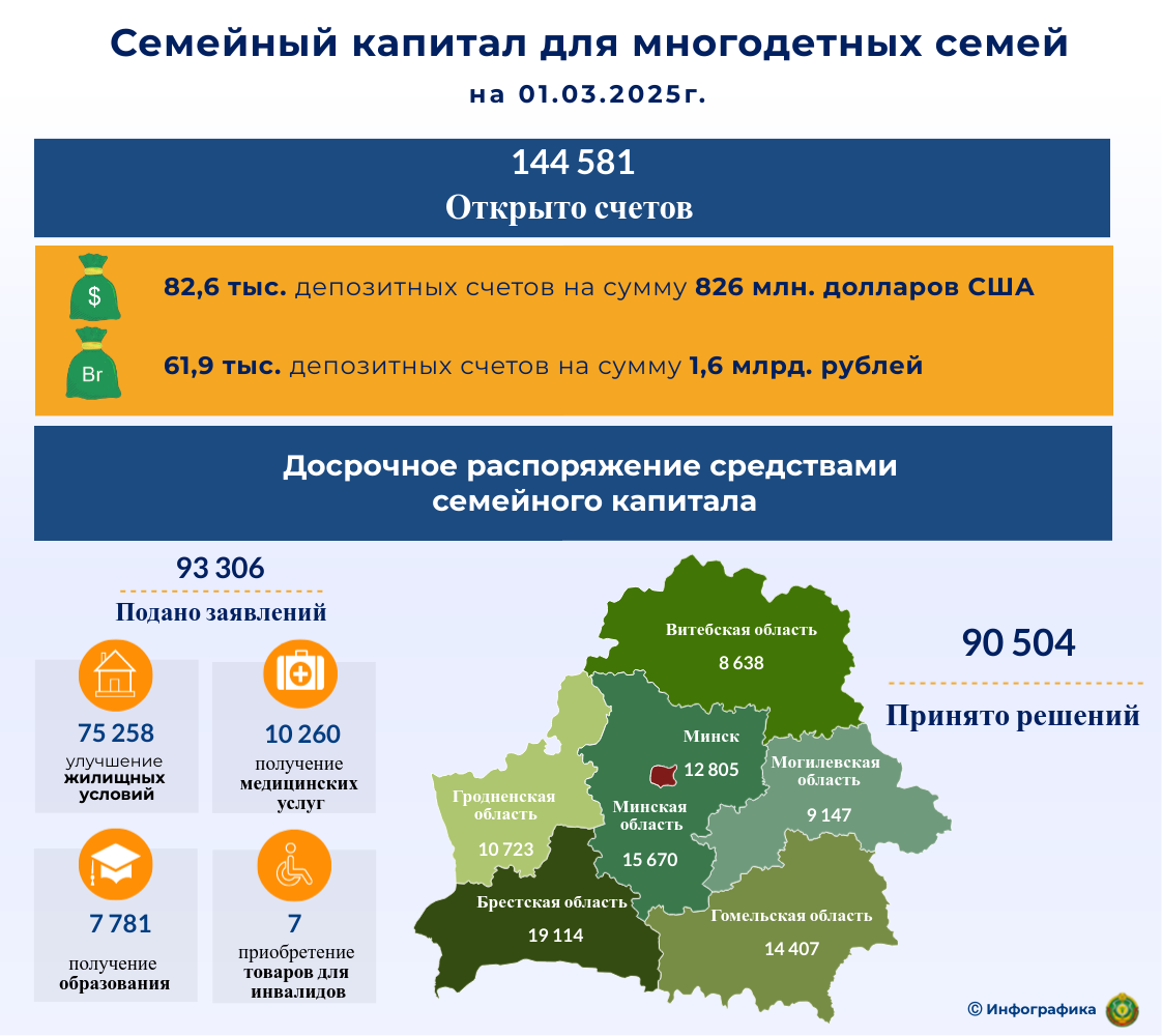 Принято 90 504 решения о досрочном распоряжении средствами семейного капитала, из них: Брестская область – 19 114, Витебская – 8 638, Гомельская область – 14 407, Гродненская область – 10 723, Минская – 15 670, Могилевская – 9 147, г. Минск – 12 805.