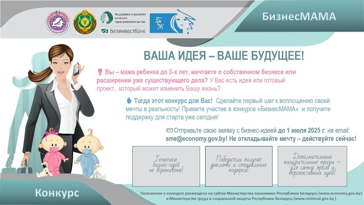 Министерство экономики совместно с Белорусским союзом женщин и ОАО «Белинвестбанк» при поддержке Министерства труда и социальной защиты объявляет о старте конкурса на лучшую бизнес-идею, бизнес-проект «БизнесМАМА».